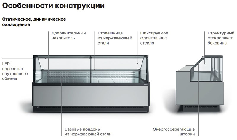 Холодильная витрина Carboma GC110 SM 1,5-1 (версия 2.0) (без боковин) предназначена для организации продажи молочных продуктов, сыров, гастрономии. Докупите к этой среднетемпературной модели еще горку, морозильную и кондитерскую витрину и у вас получится универсальный торговый ряд, выполненный в одном стиле. Витрина удобна и практична. Ее длина 142 см (149 см с боковинами), ширина 104 см, высота без учета ножек — 121 см. Ножки регулируются в пределах от 3 до 5 см, позволяют правильно установить прибор на неровном полу. Поверхность выкладки изготовлена из шлифованной нержавеющей стали, основная зона ярко освещается LED-светильником. Если нужно, светильник можно заменить. В качестве опции предлагаются светильники другой световой температуры, подсветка фронтального стекла.