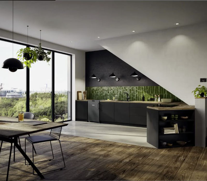 Винные шкафы представлены как с черной стеклянной дверцей, так и с застекленной дверью, фасад который вы можете заказать под интерьер.