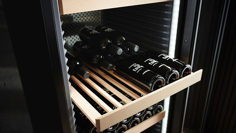 Винные шкафы представлены как с черной стеклянной дверцей, так и с застекленной дверью, фасад который вы можете заказать под интерьер.