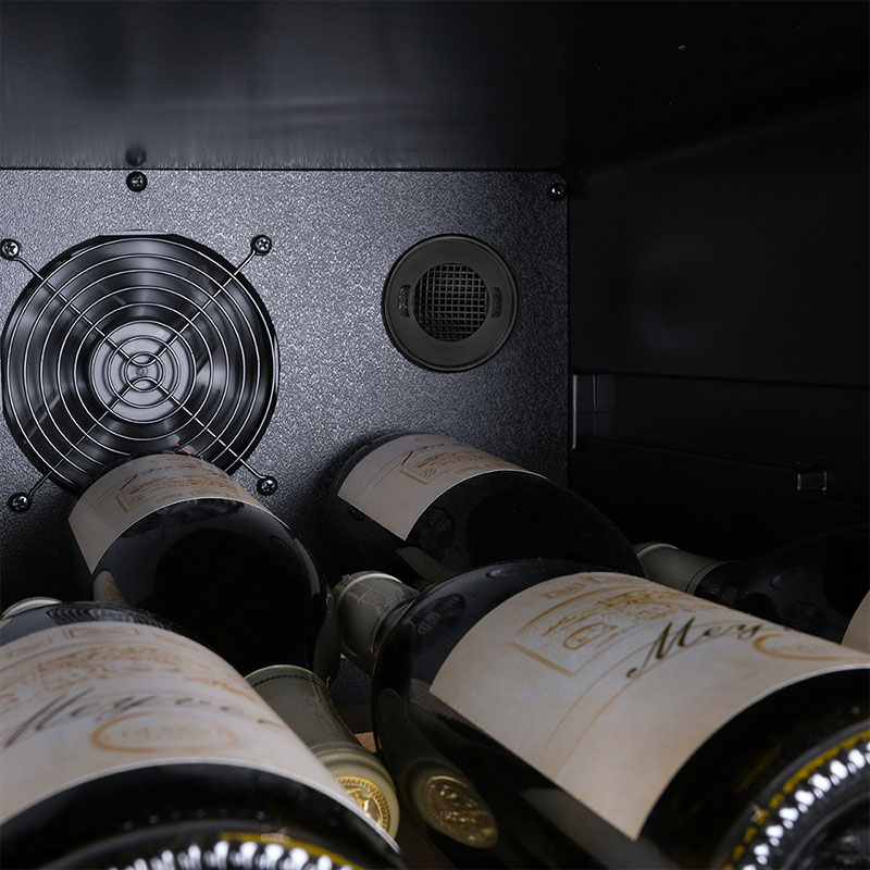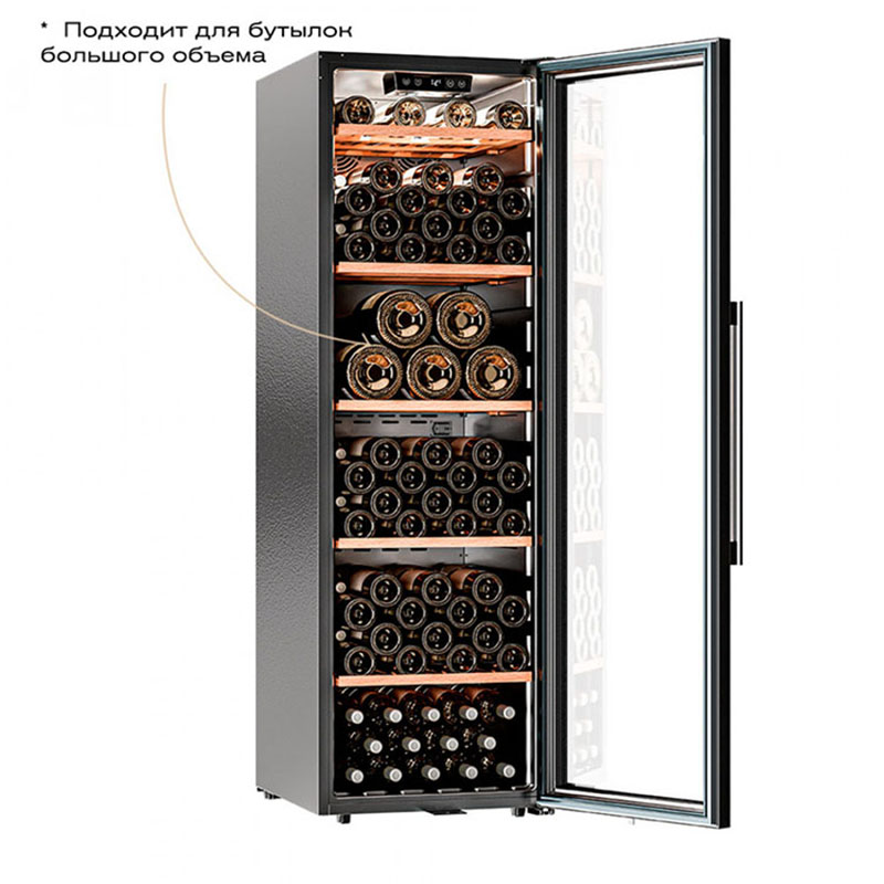 Винные шкафы представлены как с черной стеклянной дверцей, так и с застекленной дверью, фасад который вы можете заказать под интерьер.